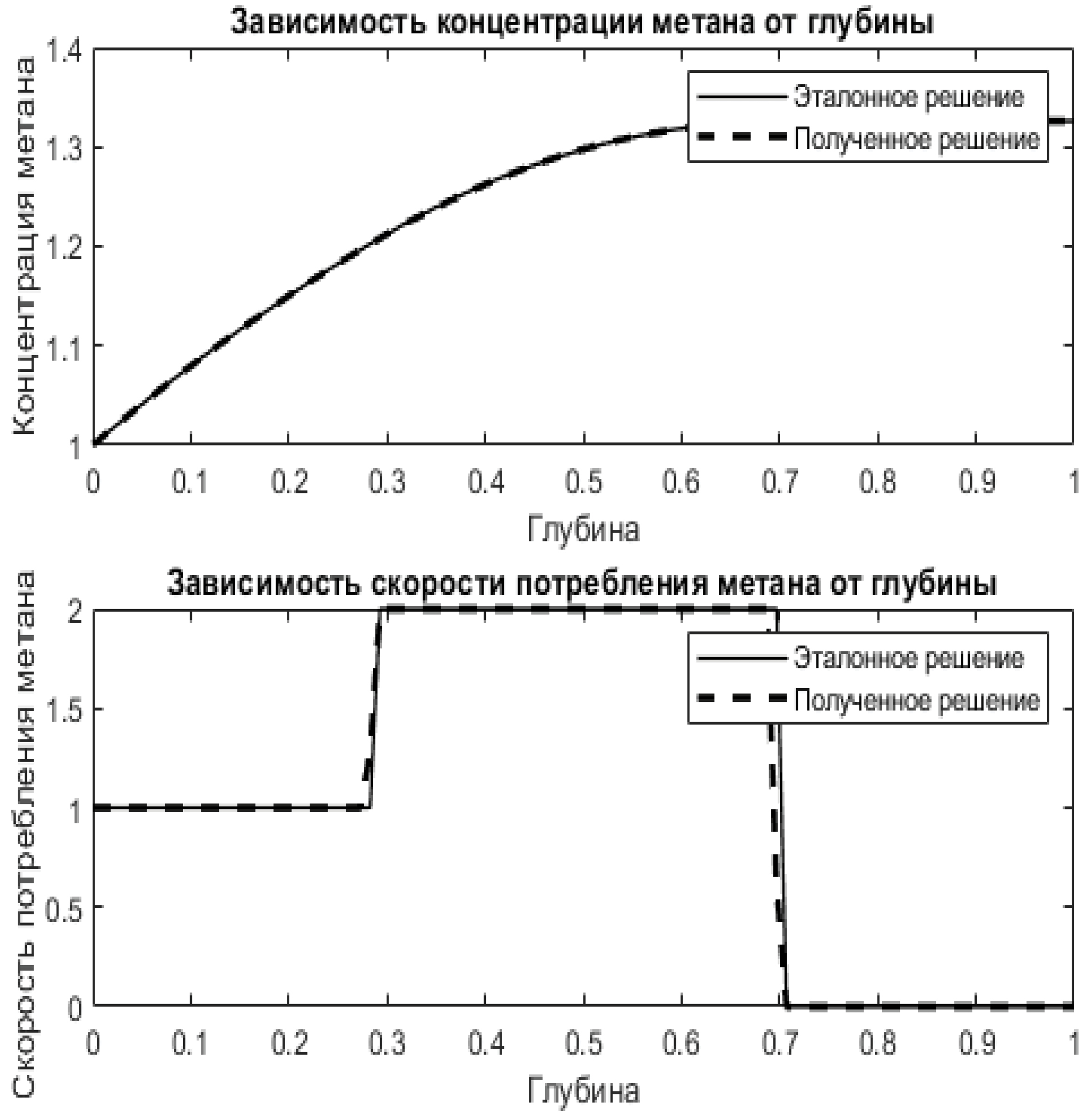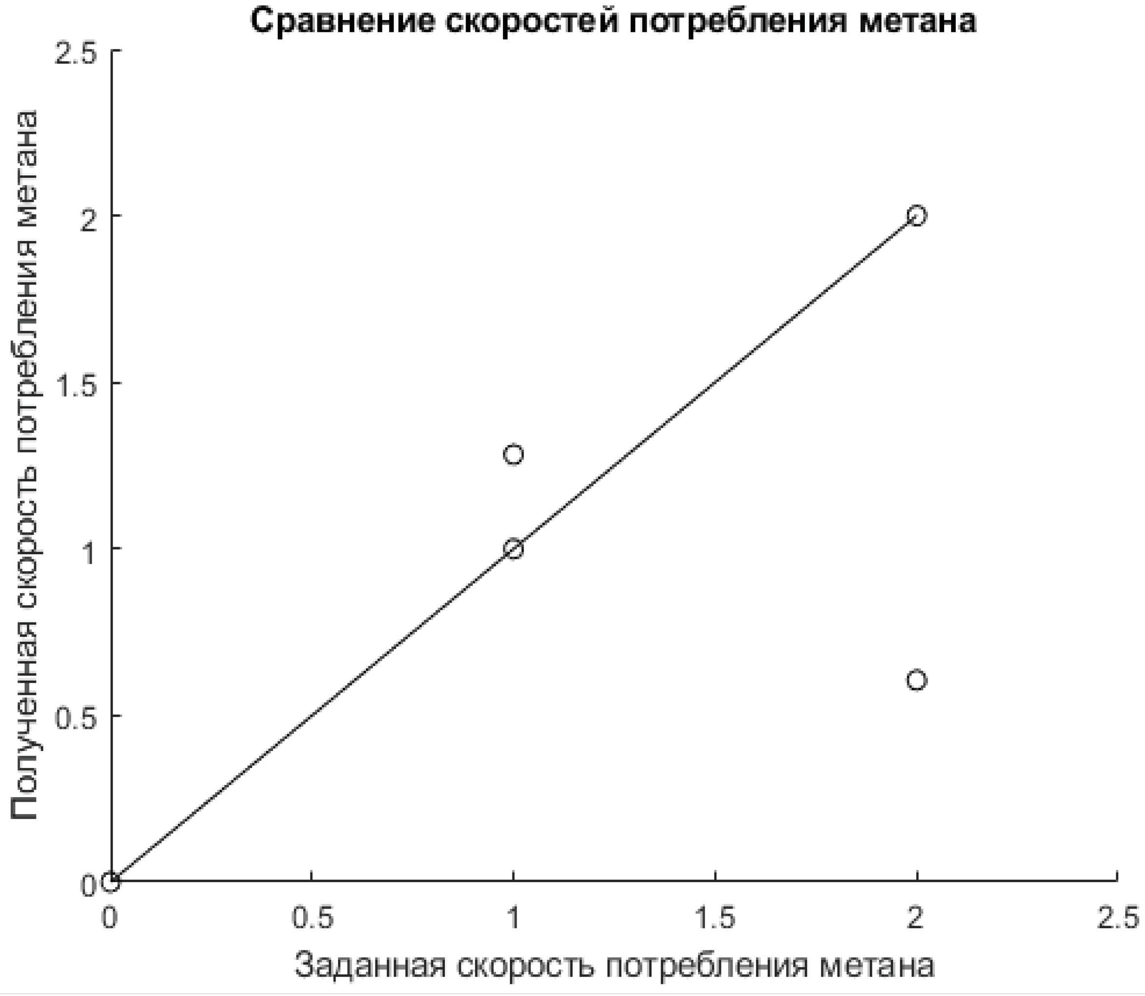 В ходе решения обратной задачи был получен вектор скорости потребления метана, который в среднем имеет отклонение от исходного на 0,016768 (MAE). При этом полученный вектор скорости имеет ошибку 0,979798 %. Полученное решение обратной задачи представлено на рисунке 3.