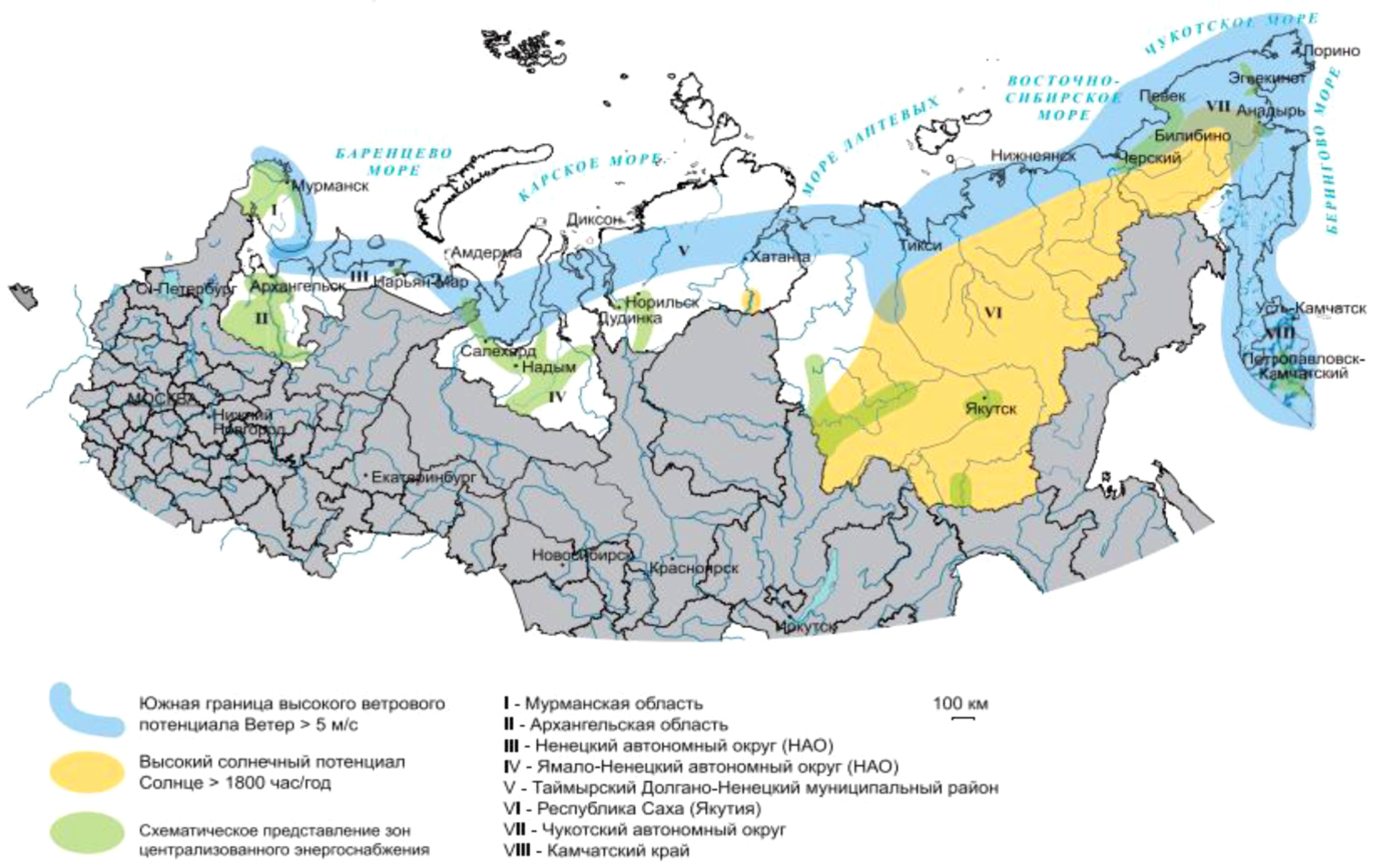 Как известно, Российская Федерация занимает примерно 17 миллионов квадратных километров, из которых 10 миллионов квадратных километров составляют северные и приравненные к ним регионы. Также около 3 миллионов квадратных километров занимают территории за полярным кругом. Население данных регионов – более двух миллионов человек, которые потребляют примерно 3,6 % электроэнергии, производимой в России. Данные регионы можно охарактеризовать как регионы с высоким ветропотенциалом и местами – с высоким потенциалом для установки солнечных электростанций. Карта с указанием потенциала в северных регионах представлена на рисунке 1 [12].