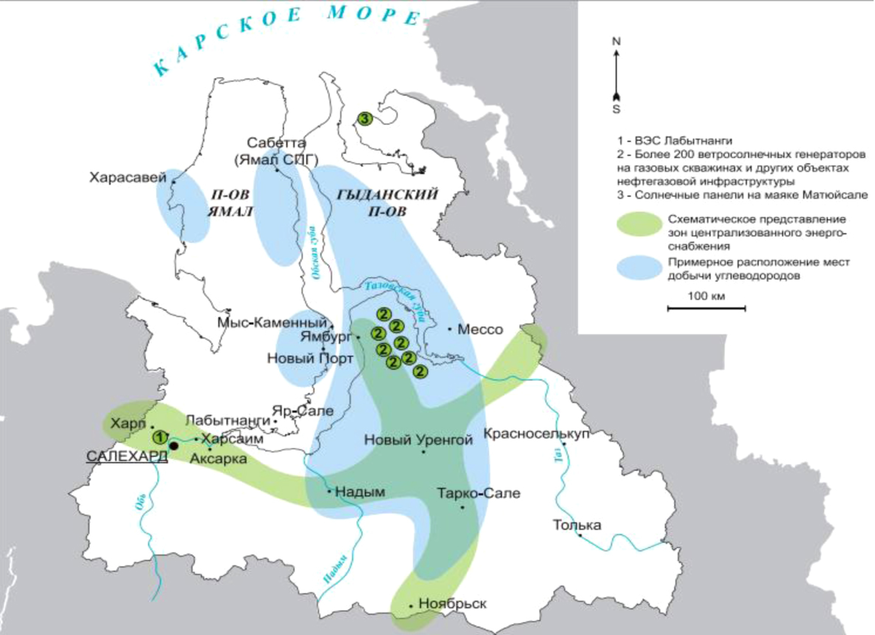 Северные регионы Российской Федерации обладают огромными месторождениями (залежами) полезных ископаемых. Благодаря этому идет активное освоение этих месторождений крупными компаниями, такими как «Газпром», «Лукойл», «Роснефть» и другими. Для снижения затрат вышеупомянутые компании вкладываются в разработки, которые помогут снизить стоимость содержания их объектов. Одной из внедренных установок стала комбинированная электроустановка, которая состояла из ветрогенератора, двух солнечных панелей и двух термоэнергетических генераторов. Данная установка была разработана ООО «Газпром добыча Ямбург». Эксплуатация данных электроустановок показала их надежность и позволила снизить стоимость электроэнергии в 2,5 раза относительно стационарного электроснабжения. На данный момент на территории ЯНАО насчитывается более 200 таких электроустановок. Карта с расположением данных электроустановок представлена на рисунке 2.