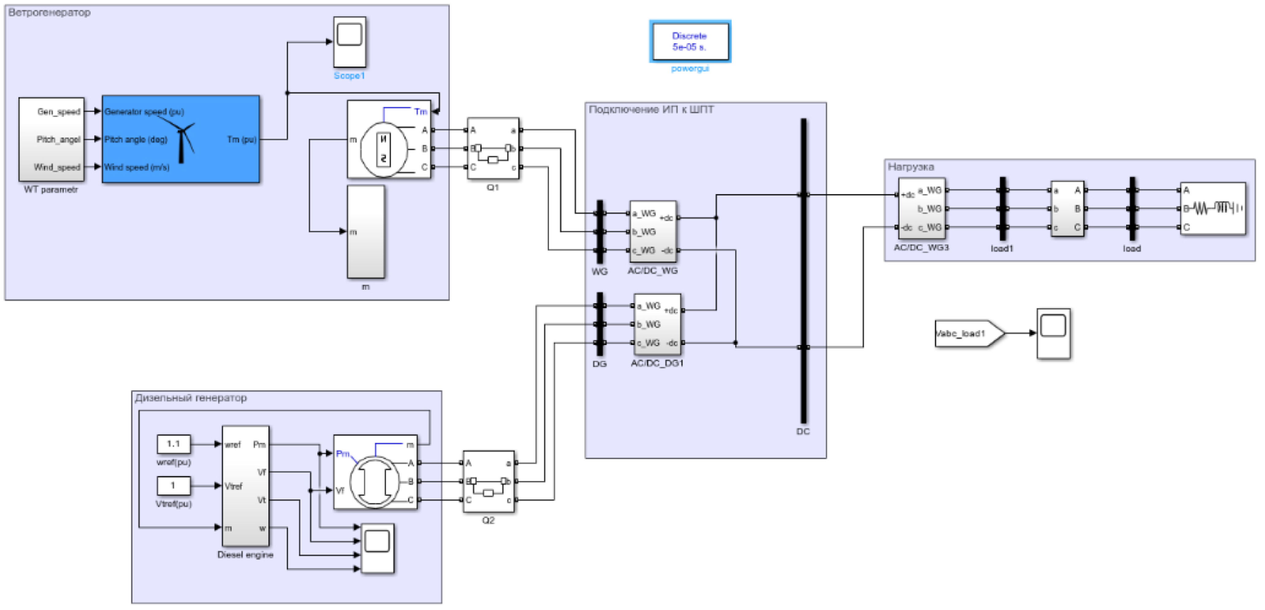 Для моделирования комбинированной установки на основе ВЭС-ДЭС был выбран программный комплекс MatLab SimuLink. Для имитационной модели в структурной схеме АКБ был заменен на блок балластных нагрузок. Разработанная модель представлена на рисунке 3. Моделирование электроустановки позволит проанализировать режимы работы, для чего в схеме предусмотрены измерительные блоки, и оценить возможность внедрения таких установок на территории Крайнего Севера.