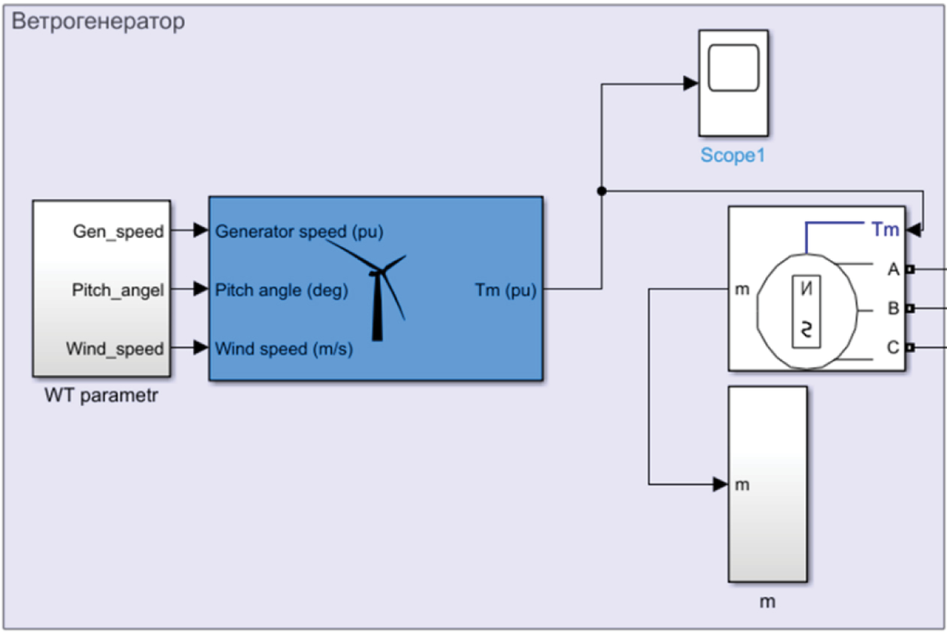 В данной модели ветрогенератор будет использоваться как основной источник питания. Однако в программе Matlab Simulink нет готового решения, в связи с чем модель ветрогенератора была собрана из следующих блоков: «Wind Turbine» и «Permanent Magnet Syncronous Machine». Первый блок имитирует ветровую турбину и передает значение крутящего момента на второй блок.