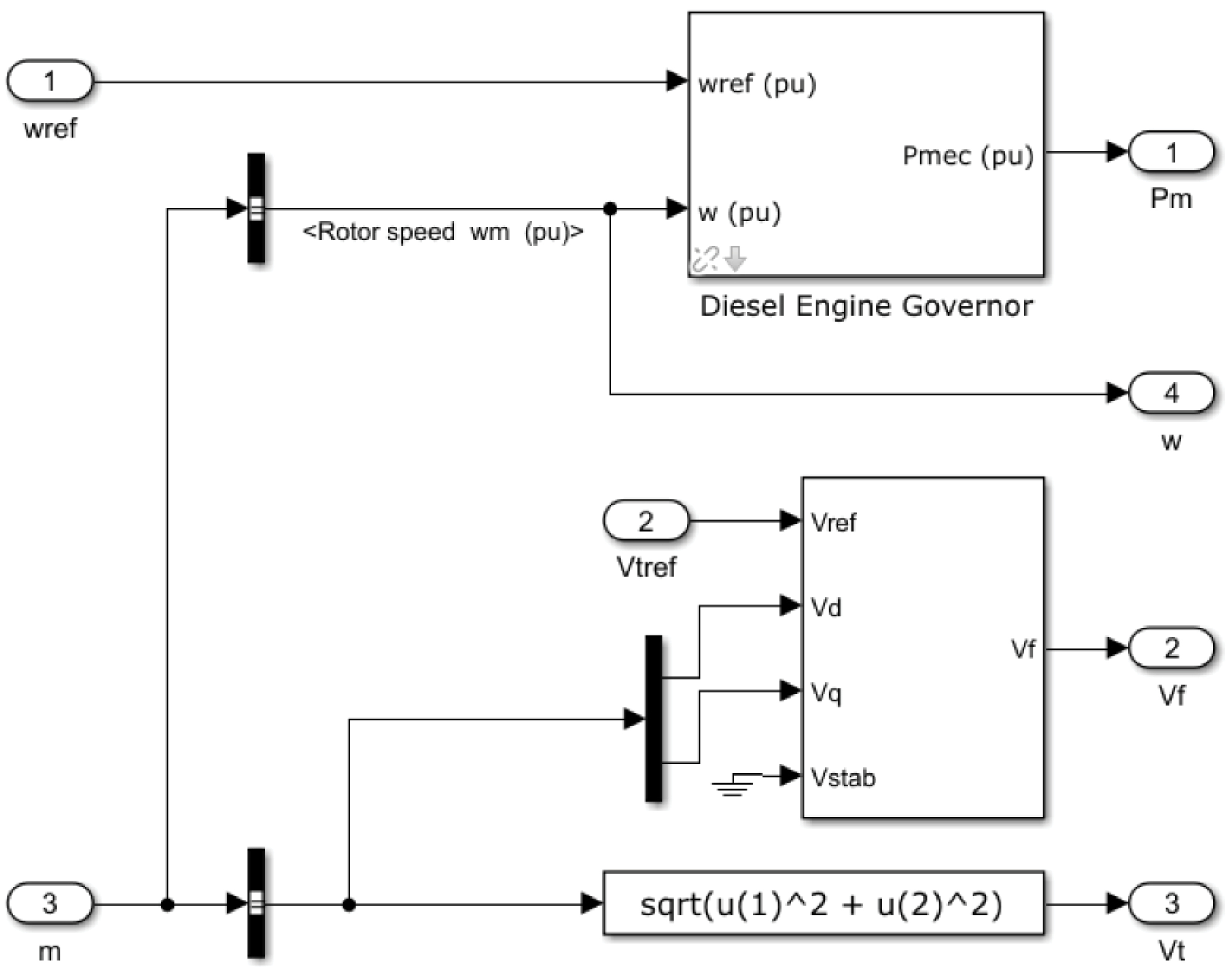 Для правильного моделирования необходимо подать на входы блока следующие сигналы: напряжение возбуждения и мощность на валу. Схема, имитирующая ДЭС, показана на рисунке 6.