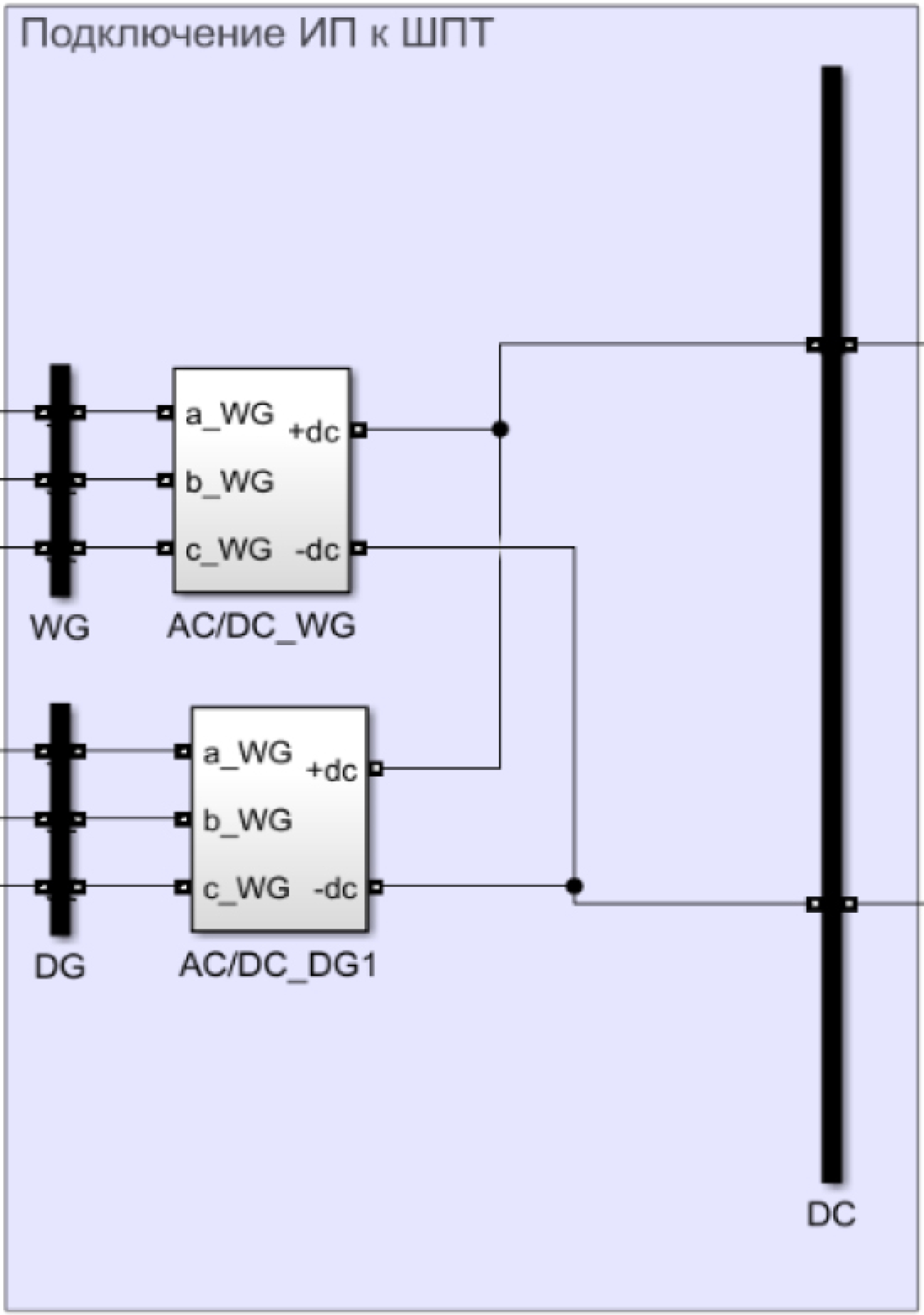 Для синхронизации источников питания используется шина постоянного тока (ШПТ), которая моделируется элементом «DC bus». Подключение к ней происходит через выпрямители, для имитации которых используются блоки диодных выпрямителей «AC/DC». Данное подключение показано на рисунке 7.