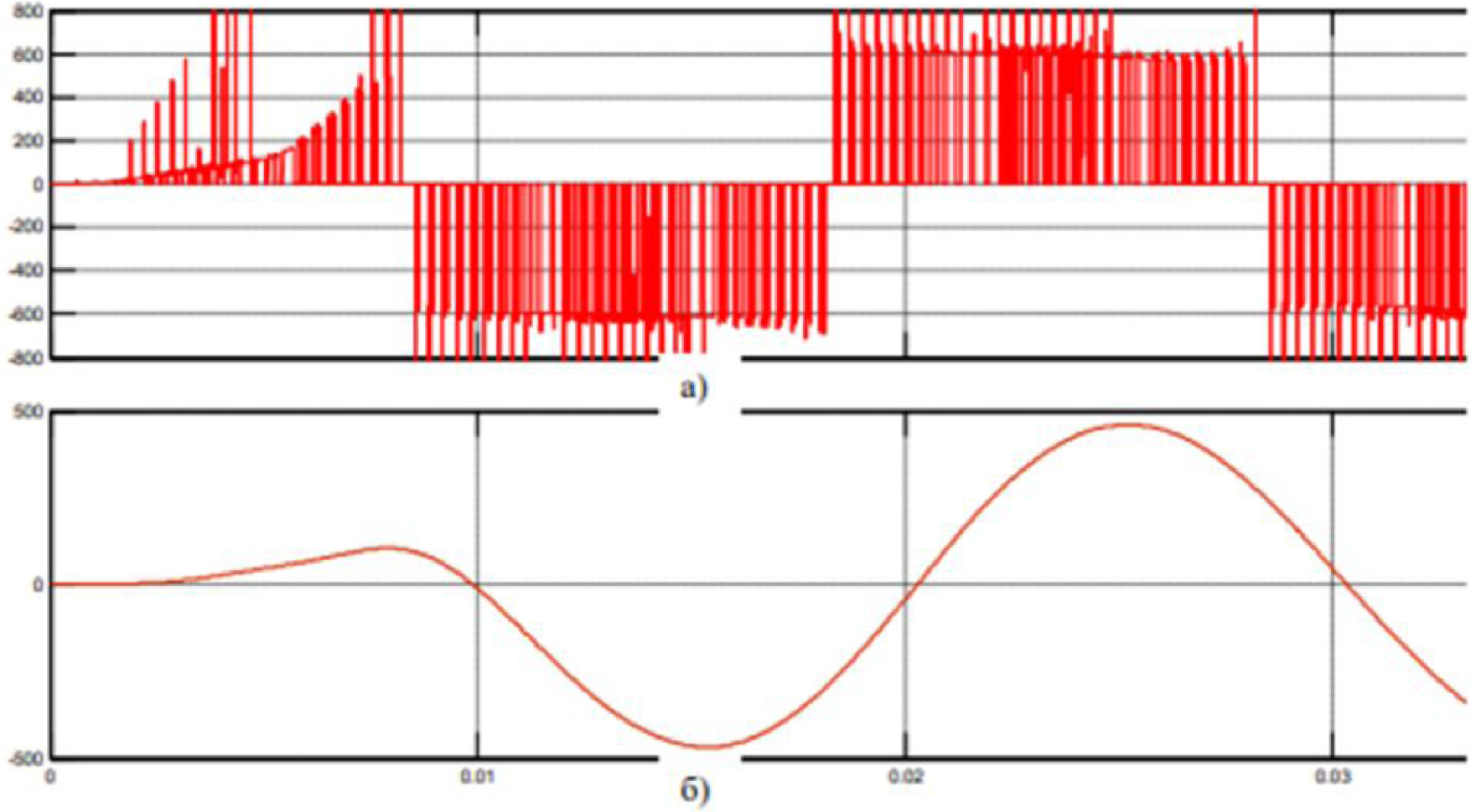 Рисунок 8. Линейное напряжение: а – на выходе инвертора; б – после дросселя