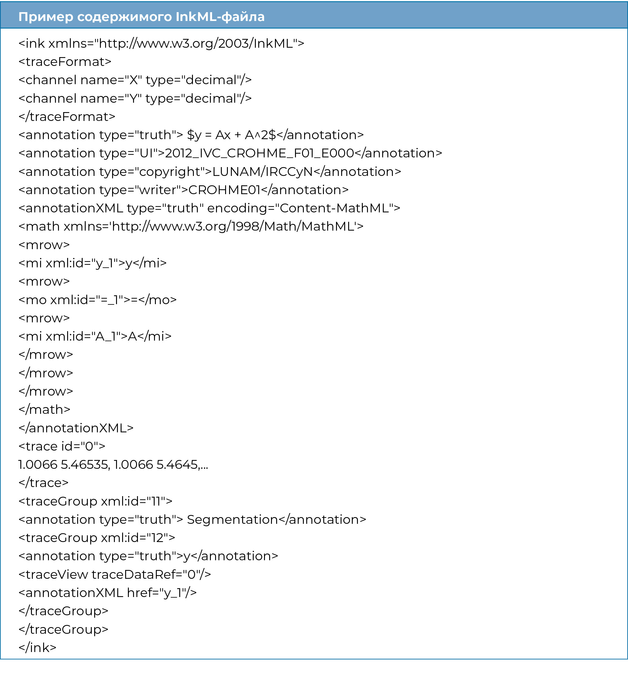 Датасет CROHME – результат многолетних наработок для одноименного конкурса. Название представляет собой аббревиатуру Competition on Recognition of Handwritten Mathematical Expressions – «соревнование по распознаванию рукописных математических выражений». Датасет содержит 22 024 тренировочных изображения и 5 255 тестовых, столько же в датасете представлено аннотаций в формате InkML. InkML – это формат файла, основанный на XML, содержит информацию о LaTeX-аннотациях, трассеры движения пера для онлайн-распознавания математических выражений. Также в датасете присутствуют файлы формата SymLG в таком же количестве, представляющие собой файлы, описывающие каждый знак в формуле, его положение и отношение между знаками.