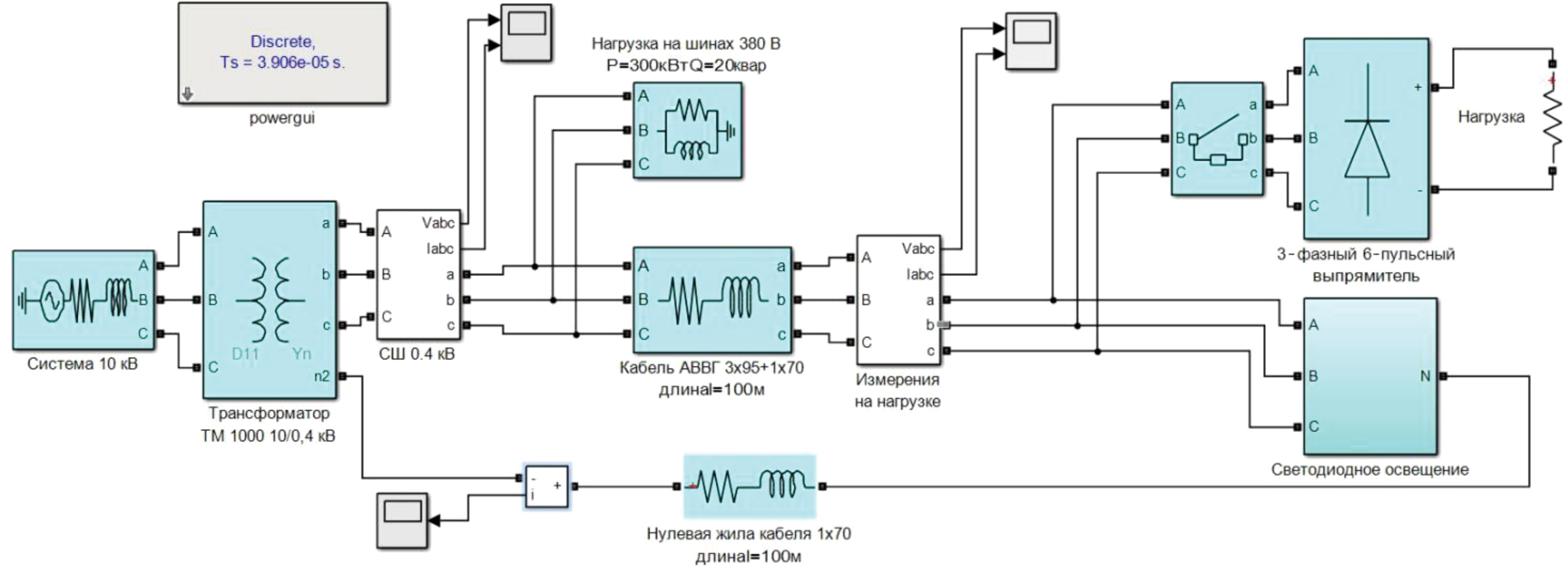 Рисунок 1. Имитационная модель для исследования несинусоидального режима в сети до 1 кВ