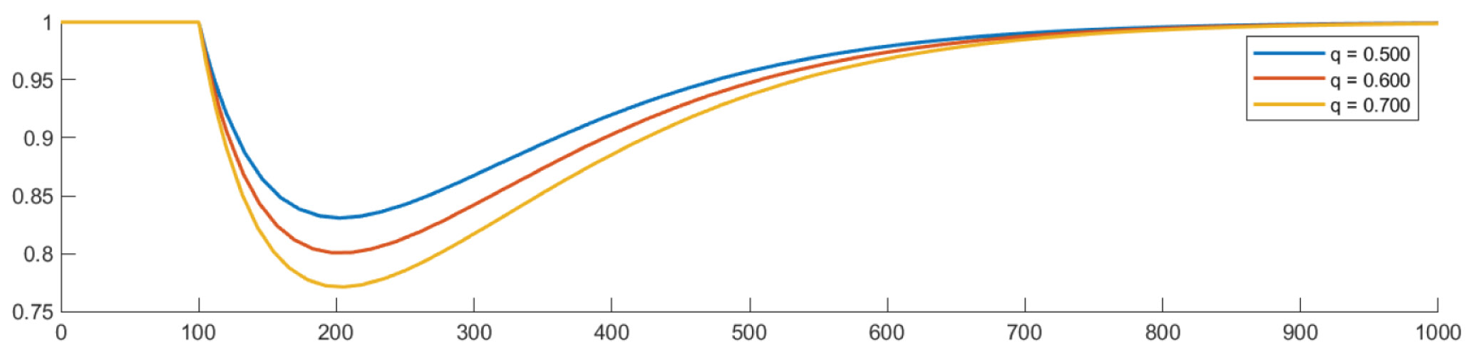 Рисунок 2. Распределение уровня кислорода при q = 0,5, q = 0,6 и q = 0,7