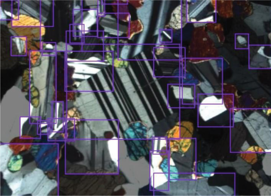 Чаще всего двойники бывают полисинтетические, в этом случае в шлифе в скрещенных николях плагиоклазы выглядят полосатыми, цвет полосок варьируется от темного (черного) до белого. Также могут встречаться простые двойники, тогда полосок всего две: светлая и темная. В любом шлифе, помимо срезов с полосами, часть зерен также будет однородная – серого, белого или темного цвета, но можно понять, что это тоже плагиоклазы, т. к. рядом присутствуют зерна с двойниками. Размер зерен плагиоклазов может варьироваться в широких пределах: в вулканических породах можно встретить лейсты – мельчайшие иголочки плагиоклазов, а в интрузивных (глубинных) магматических породах, таких как граниты и анортозиты, нередко вырастают крупные и даже гигантские кристаллы. Изредка в вулканических породах попадаются так называемые зональные плагиоклазы, у которых нет характерных полос, зато в кристалле чередуются светлые и темные зоны. В данной работе для обучения были отобраны все виды плагиоклазов из различных типов пород и в различном окружении: в массе и единичные зерна, только плагиоклазы и в сочетании с другими похожими по внешнему виду минералами, такими как кварц, калиевые полевые шпаты, нефелин. Всего набор составил 318 изображений, на каждом из которых находилось от 1–6 до 92 экземпляров плагиоклазов. Пример изображения, использованного для обучения моделей, представлен на рисунке 1.