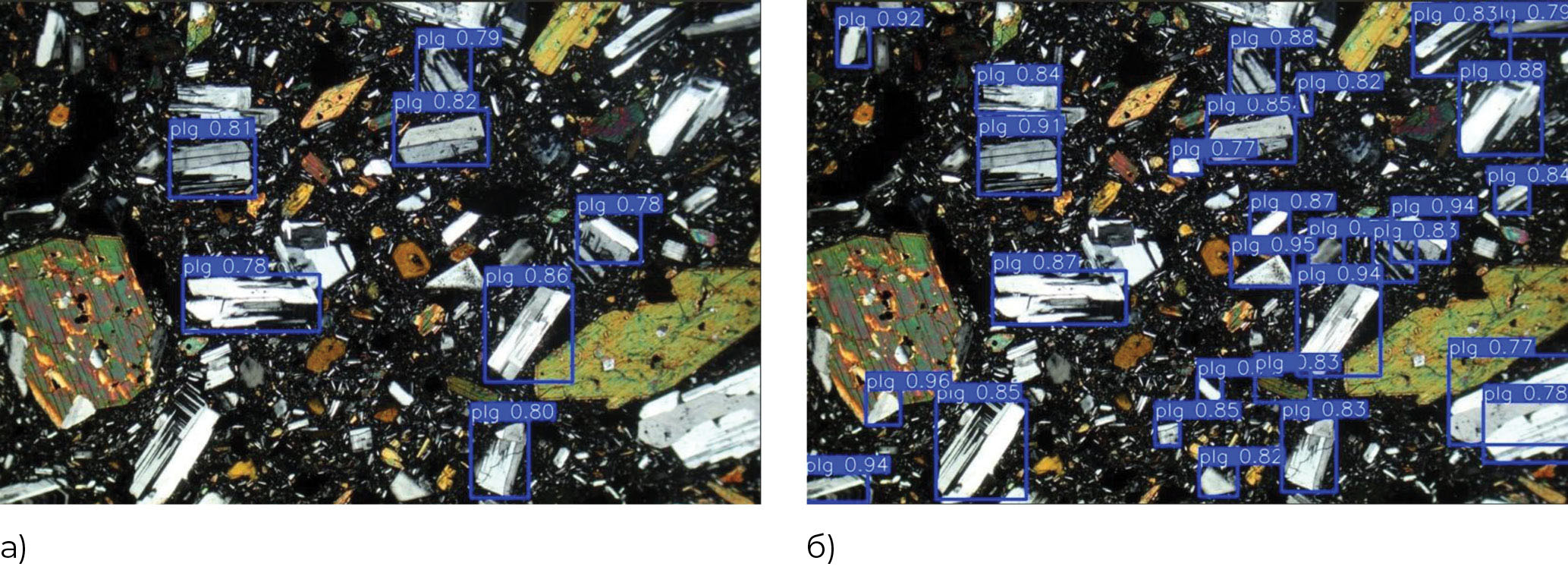Модель же, обученная пусть и на гораздо большем наборе изображений, но с выделенными только типичными, достаточно крупными зернами плагиоклазов, показала худшие результаты и обнаружила на идентичном фото лишь 23 объекта, из них 9 идентифицировала с вероятностью > 0,75 (рисунок 2а). Ошибок в определении модель также не совершила, но в целом выделила в три раза меньше объектов.