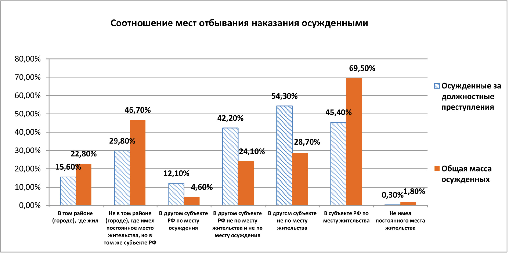 Рисунок 1. Соотношение мест отбывания наказания общей массы осужденных и осужденных за должностные преступления