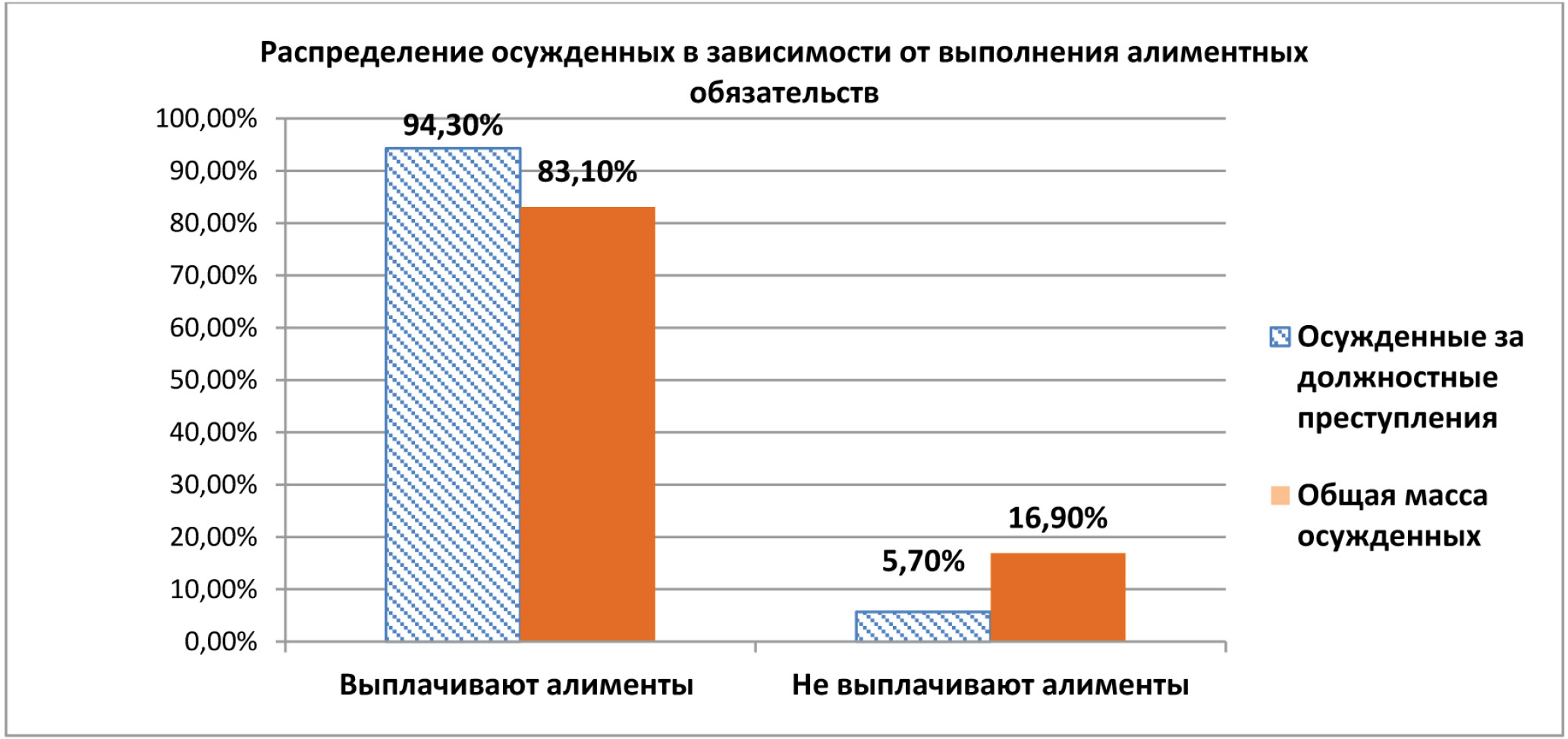Осужденные за должностные преступления в большей степени выплачивают алименты (94,3 %) по сравнению с общей массой осужденных (83,1 %). Доля общей массы осужденных, не выполняющих алиментные обязательства, почти в три раза (если быть точнее – в 2,9 раза) больше доли осужденных за должностные преступления (рисунок 2).