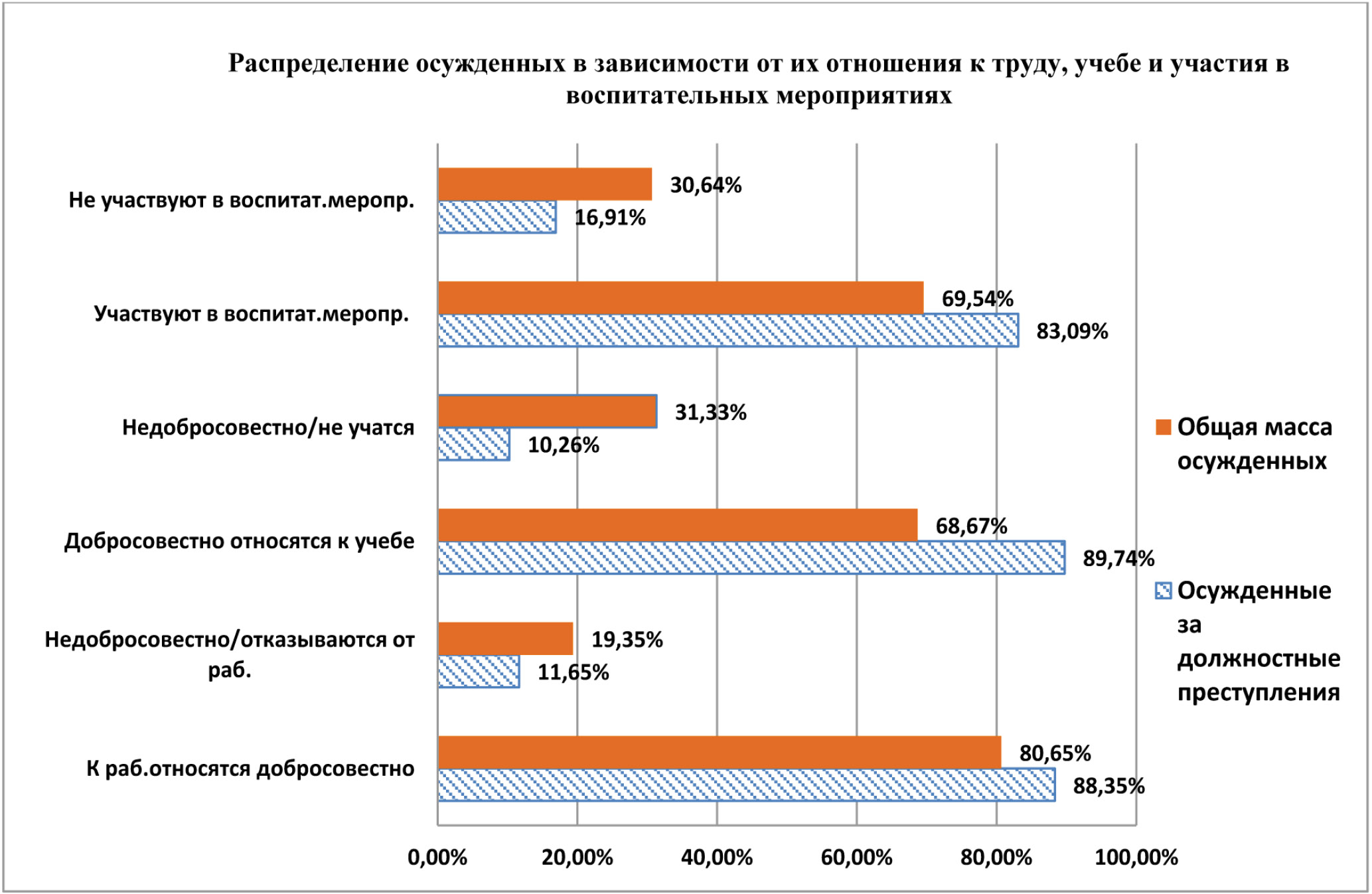 - можно сделать общий вывод, что осужденные за должностные преступления в большей степени (по сравнению с общей массой лишенных свободы) участвуют в воспитательных мероприятиях (83,09 %), склонны относиться к труду (88,35 %) и учебе (89,74 %) добросовестно;