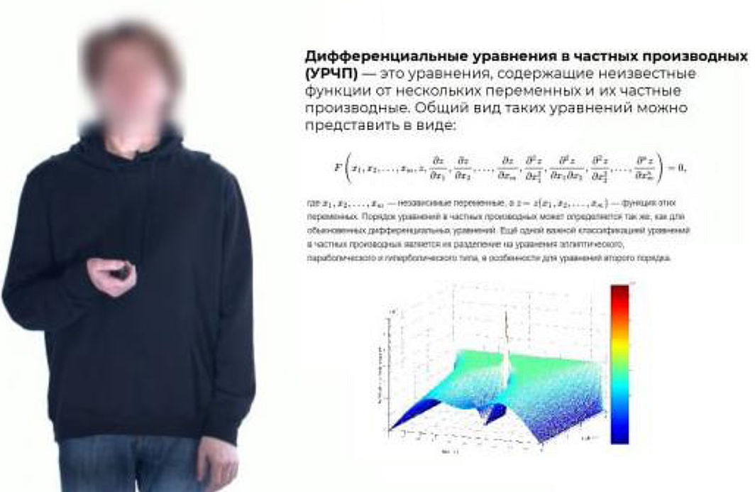 The objects of research in this article are video lectures of three main types, serving as sources of multimodal data for analysis and processing. The first type – «Lecturer and Presentation» – includes video recordings where the lecturer is positioned to the left or right of the accompanying presentation, with an emphasis on the visual combination of the human figure and slides. The second type – «Presentation and Voiceover» – focuses on theoretical material presented on the presentation slides, with explanation off-screen through the audio track. The third type – «Lecturer and Blackboard» – covers recordings where the lecturer writes material on a classic chalk or marker board, emphasizing handwritten input of information.
