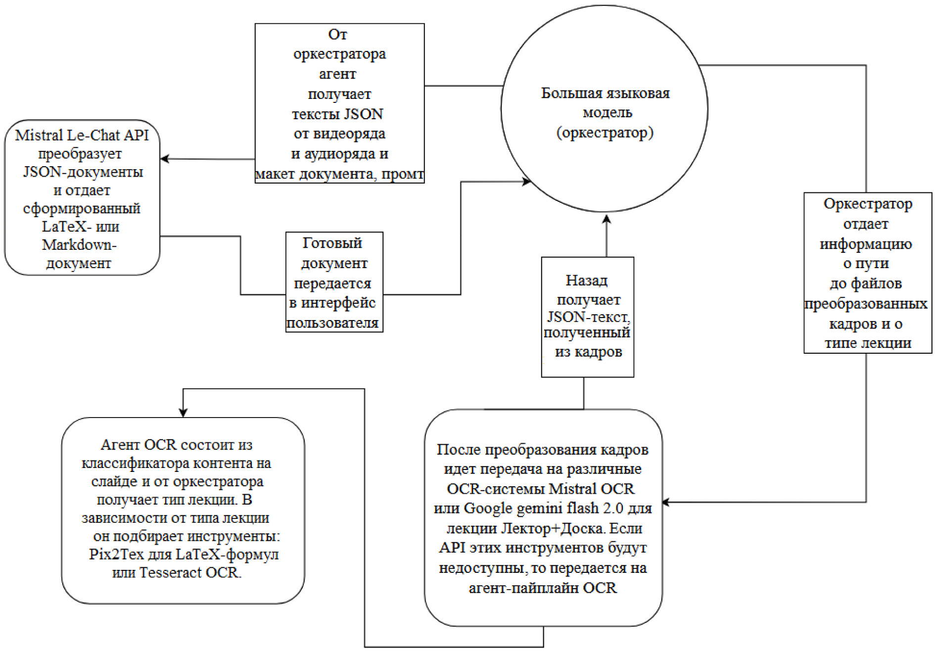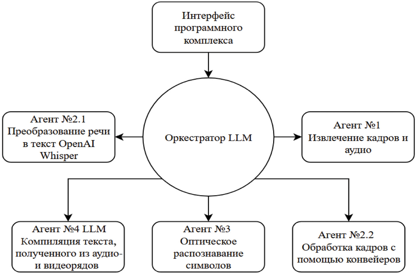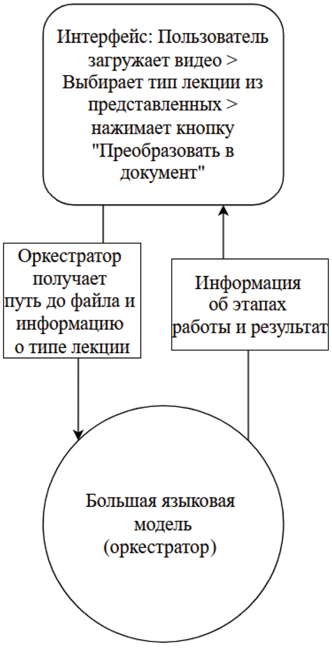 Research findings: An architecture for a multi-agent system has been developed and justified based on the «Orchestrator-Performer» pattern with a hybrid approach, integrating pipeline video processing into a multi-agent environment for effective task distribution and load management. Models and tools have been selected and described, namely orchestrators, audio processing models, OCR, taking into account lecture types for adaptive pipelines. The functioning of agents is described, including initialization, interaction with the orchestrator, parallel audio/video processing, and aggregation of results into a text document with the possibility of downloading/printing.