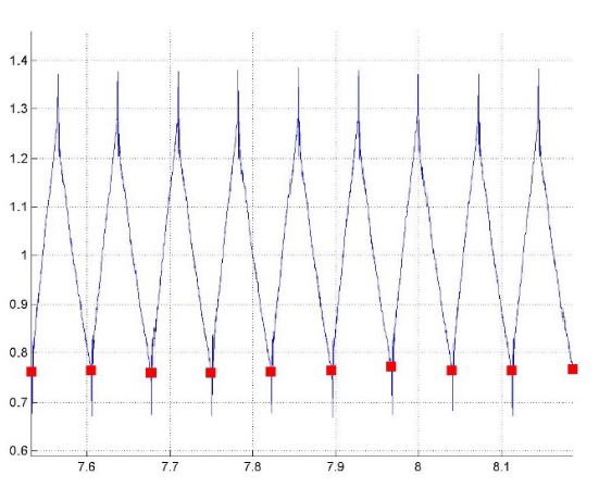 Для формирования диаграммы Пуанкаре, сначала производим выборку значений тока из временного ряда, полученного при определенном значении коэффициента П-звена (α). Выборка производится по наступлению определённого события, а именно по спаду коммутационной функции (Kf). Пример временного ряда с выборкой данных представлен на рисунке 3, где квадратными маркерами отмечены значения тока, выбранные по фронту Kf.