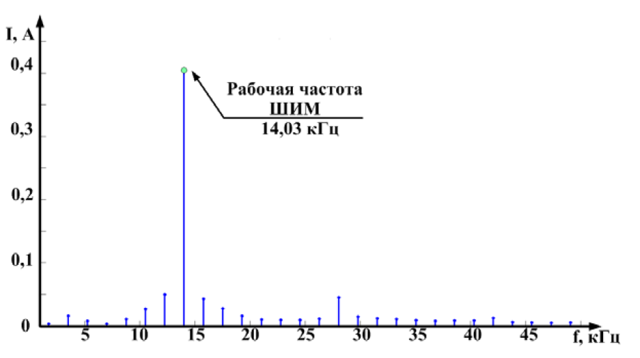 На первом шаге выполняется определение, с требуемой точностью, рабочей частоты ШИМ (Fшим). Поиск производится в окрестности рабочей частоты 14 кГц. Результат выполнения первого этапа представлен на рисунке 5.