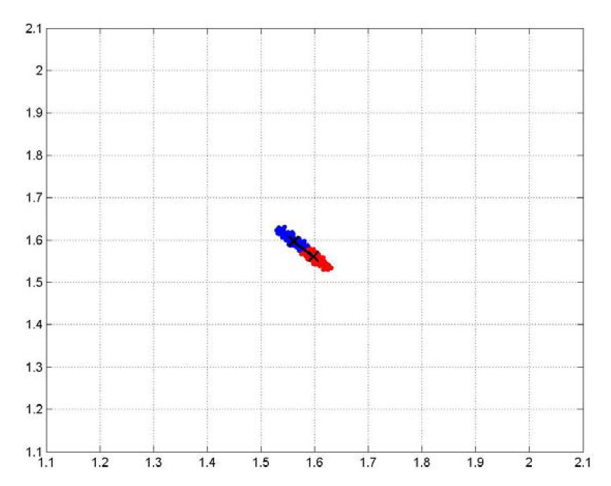 Согласно алгоритма k-средних входной массив данных диаграммы Пуанкаре разделяется на два кластера, K1 и K2 соответственно. После чего производится вычисление центров полученных кластеров (OK1 и OK2) и расстояния между ними (d). Расстояние между центрами кластеров вычисляется согласно формуле расстояния Евклида: . Результат работы представлен на рисунке 6.