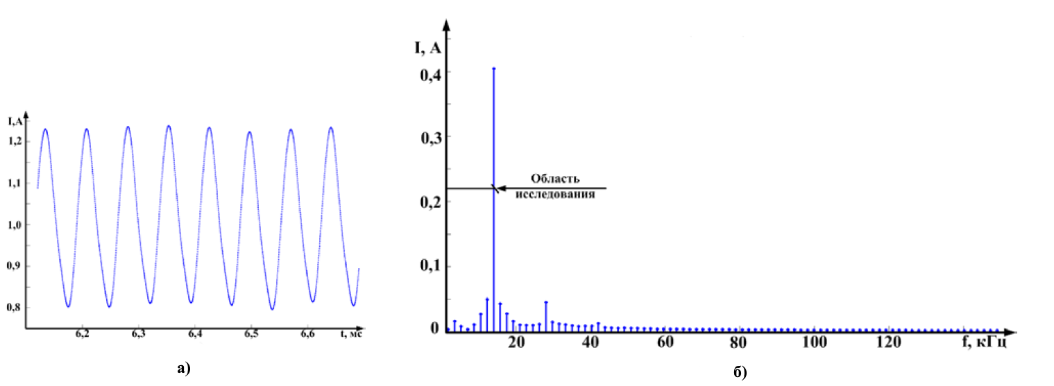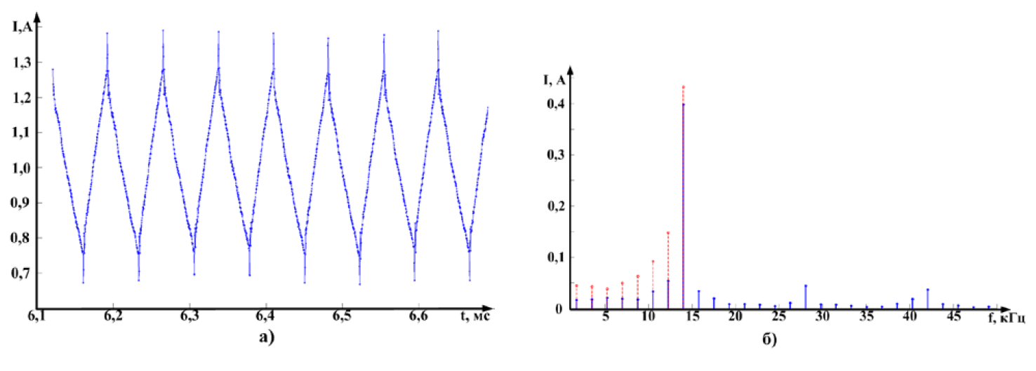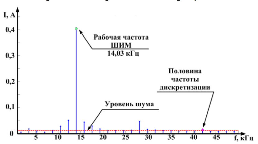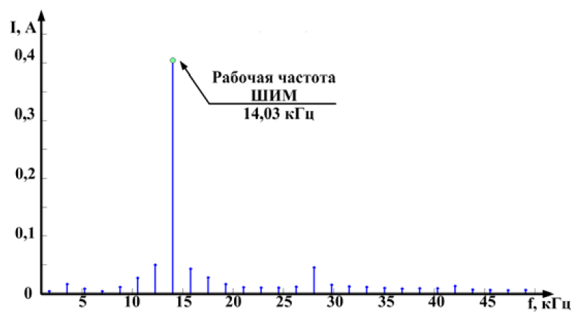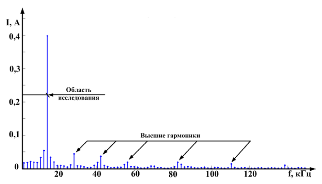 В рамках исследования динамики импульсного преобразования энергии проводится анализ частотного спектра в диапазоне (0…14 кГц), где14 кГц частота синхронизации ШИМ регулятора [5]. Как видно из рисунка 2 вне области исследования (0...14 кГц) имеется значительное количество высших гармоник с амплитудами сигнала более 10 % от основной. В этой связи, согласно [6] изменение частоты дискретизации без возникновения эффекта элайзинга невозможно.