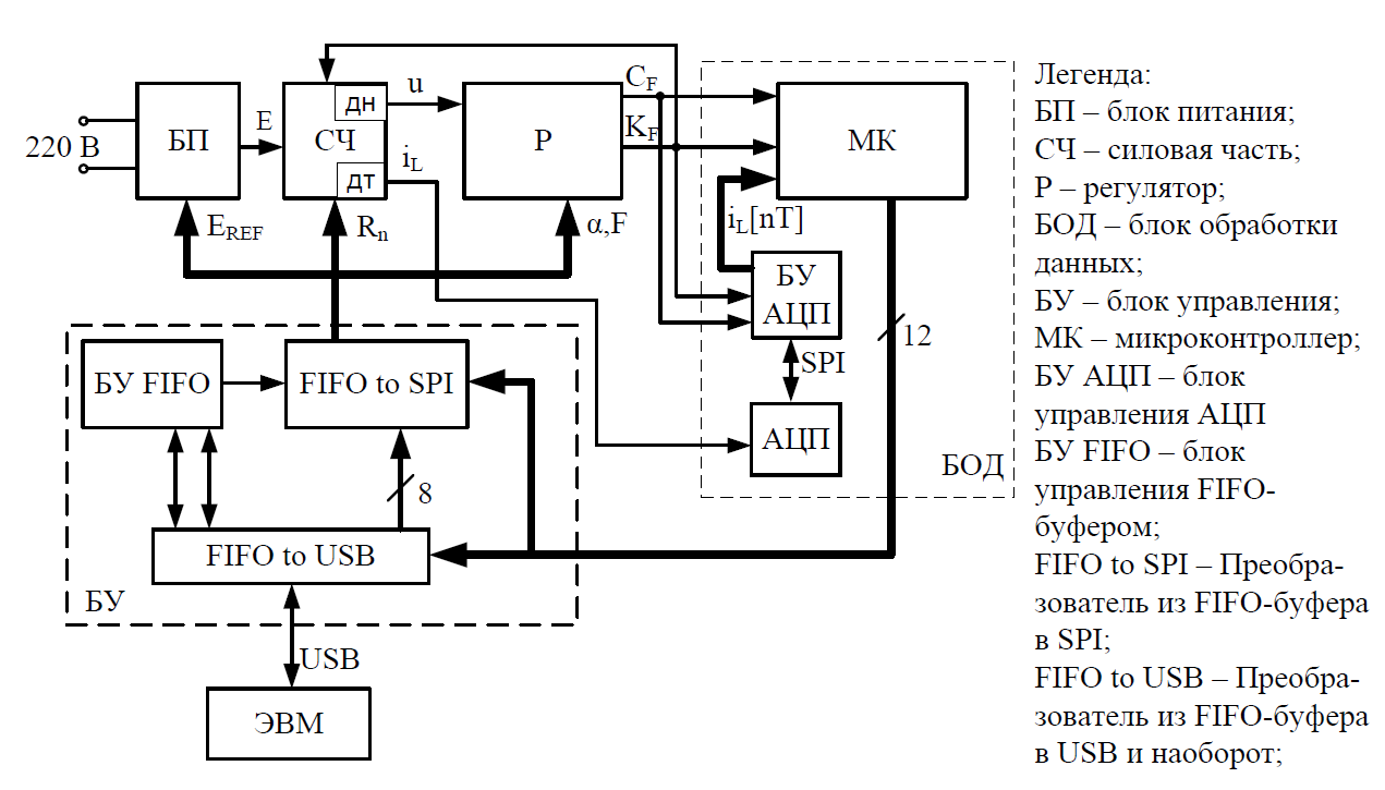 Проверка работоспособности алгоритмов определения оптимальной частоты дискретизации и идентификации типа процесса проводилась на данных полученных на экспериментальной установки «Импульсный преобразователь напряжения» (24В-60Вт) структурная схема которой представлена на рисунке 6.