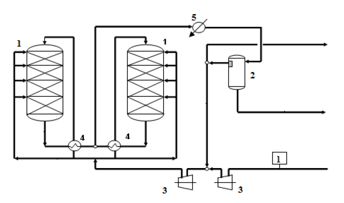 Рисунок 1: Схема реакторного блока синтеза метанола. 1 – реактор синтеза метанола, 2 – сепаратор метанола-сырца, 3 – компрессор, 4 – рекуперационные темлообменники, 5 – конденсатор метанола-сырца.