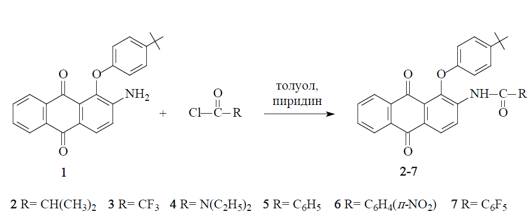 1-п-трет-бутилфенокси-2-ациламиноантрахиноны (2, 4-7) получены ацилированием 1-п-трет-бутилфенокси-2-амино-9,10-антрахинона (1) соответствующими ацилхлоридами в толуоле в присутствии пиридина. Для синтеза соединения 3 в качестве ацилирующего агента использовали ангидрид трифторуксусной кислоты.