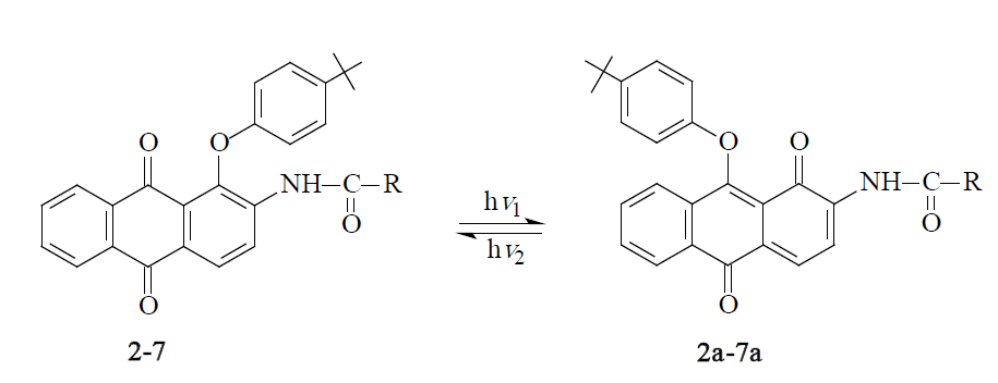 Для установления влияния характера заместителя в положении 2 на фотохромные свойства 1-арилоксиантрахинонов растворы полученных соединений в бензоле или толуоле подвергались действию УФ-света (светофильтр УФС-1) с одновременным измерением электронных спектров поглощения (ЭСП) через определенные промежутки времени до получения максимальной оптической плотности фотоиндуцированной формы. Известно [11], что фотоизомеризация 1-арилокси-9,10-антрахинонов с образованием глубокоокрашенных 9-арилокси-1,10-антрахинонов для большинства производных обратима и протекает по нижеприведенной схеме 2.