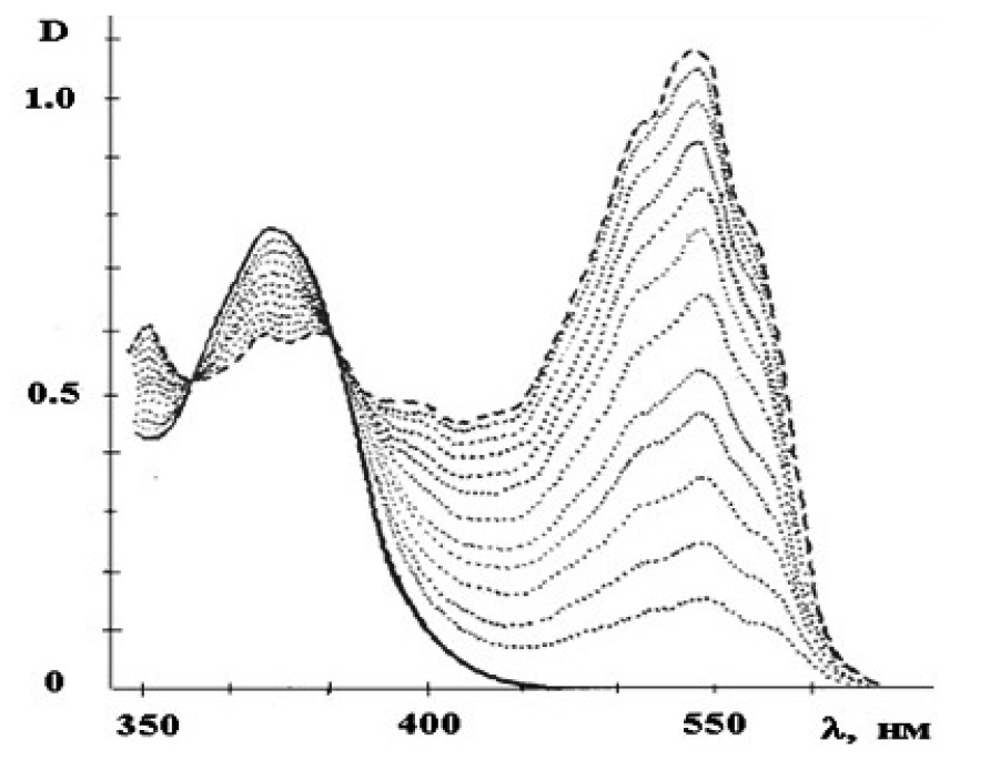 На рис. 1 показаны характерные спектральные изменения исследуемых образцов в ходе облучения. Растворы ациламинопроизводных 2-7 при облучении УФ-светом изменяют цвет от светло-желтого до красно-фиолетового с сохранением всех изобестических точек. Наличие изобестических точек говорит об однозначности процесса, т. е. фотоинициируемая перегруппировка пара-хиноидной структуры в ана-хиноидную происходит без образования побочных продуктов.