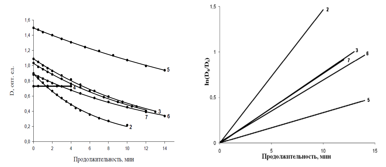 Из данных, приведённых в таблице 1, следует, что заместители в положении 2 в ядре антрахинона оказывают влияние как на скорость фотоизомеризации (kпр. и kобр.), так и на устойчивость фотоформы (kдестр.). Светочувствительность (скорость достижения фотостационарного состояния) оказалась выше у соединений 3 и 7 с электроноакцепторными заместителями в ацильном остатке. Кинетические зависимости процессов фотоокрашивания представлены на рисунке 2.
