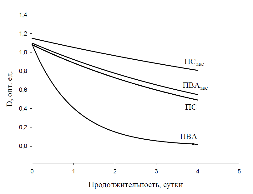 Для оценки термической стабильности фотоиндуцированной формы, предварительно засвеченные исследуемые ФХМ, были разделены на две группы: первая группа ФХМ хранилась в затемненном контейнере на воздухе, а вторая в эксикаторе. Изменение оптической плотности полимерного слоя контролировали с помощью спектрофотометра в течение четырех суток. На рисунке 5 представлены результаты измерения скорости темновой деструкции фотоформы в ПВА и ПС.