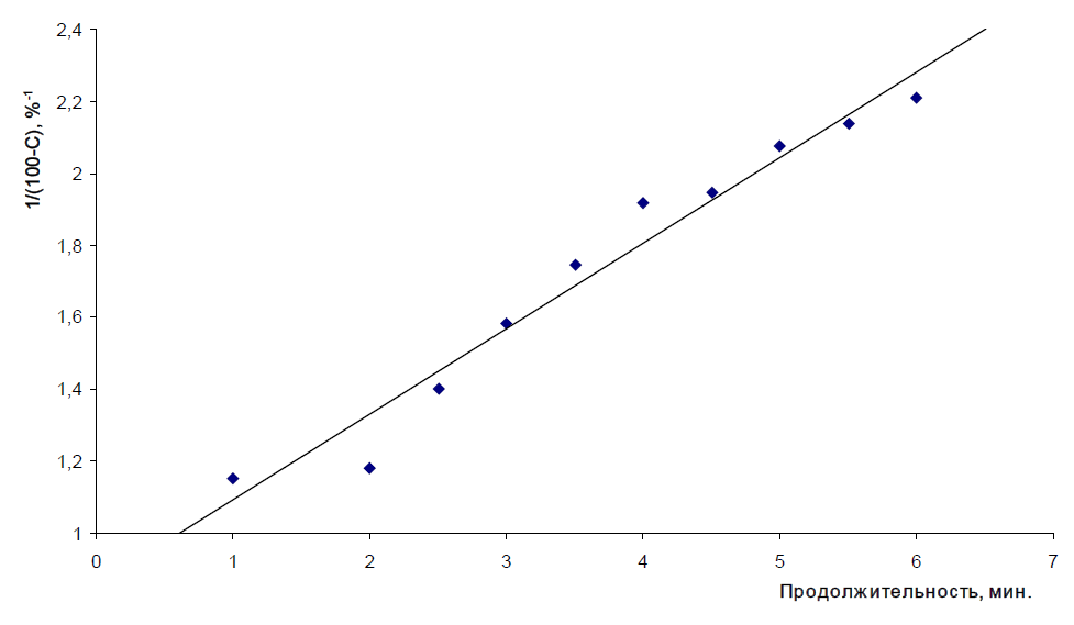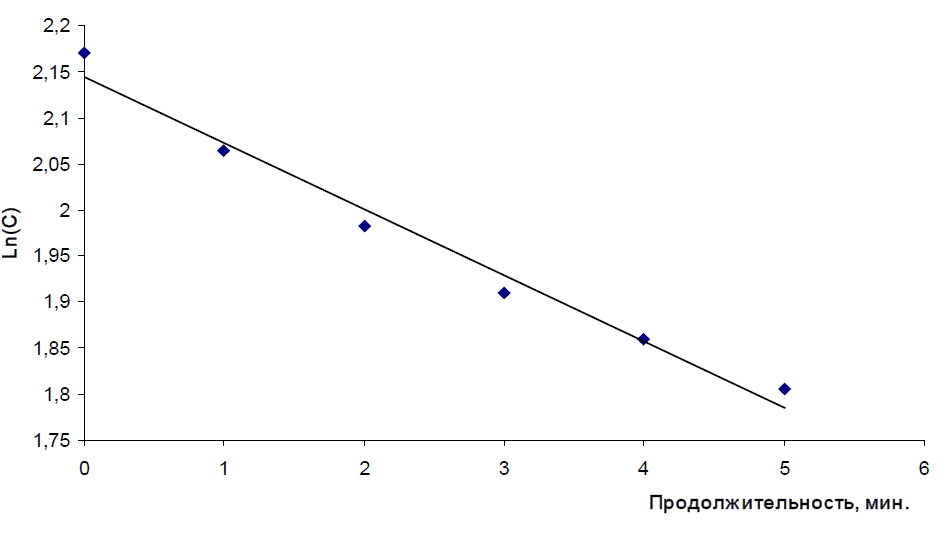 На основе полученной кинетической кривой, графическим методом показан первый порядок реакции и рассчитана константа скорости гидролитической деструкции целлюлозы (рис. 3).