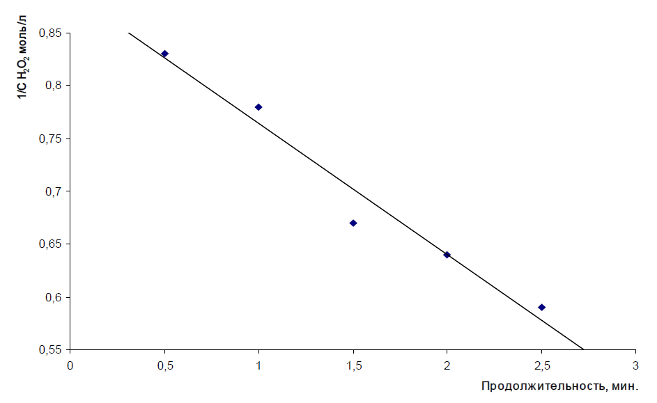Скорость образования пероксида водорода определяли перманганатометрическим методом. Для этого эквивалентный объем дистиллированной воды помещали в роторный кавитационный аппарат конструкции А.Д. Петракова и подвергали сонолизу. Через заданные временные интервалы из аппарата отбирали пробы и путем титрования в них определяли концентрацию пероксида водорода.