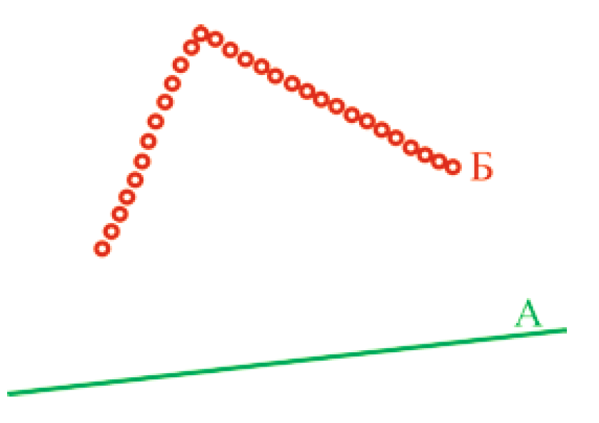 Построим геологическую модель (рис. 1), состоящую из плоской непрерывной границы раздела А и антиклинального перегиба Б, представленного точками дифракции.