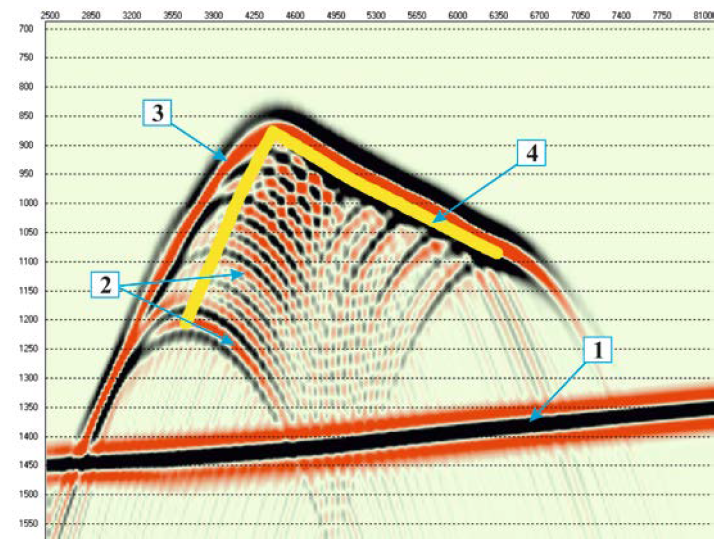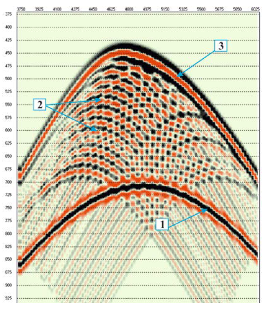 На рисунке 3 показан суммарный временной разрез ОГТ, на котором также отчетливо прослеживается отражающий горизонт (3), сформированный огибающей совокупности дифрагированных волн. При этом, при увеличении количества точек дифракции до бесконечности дифрагированные волны взаимоуничтожатся (в результате интерференционного сложения) за исключением суммы по их огибающей [3].