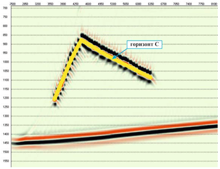 По мигрированному временному разрезу выполнена корреляция горизонта С (рис.4), которая наложена на немигрированный временной разрез (см. рис. 3). Из анализа разрезов видно, что местоположение границы Б на мигрированном разрезе (соответствует горизонту С) совпадает с минимумами годографов дифрагированных волн на суммарном временом разрезе. Из выше сказанного можно сделать вывод, что в результате миграционных преобразований удается избавиться от влияния сейсмического сноса и получить изображение отражающих границ не только в действительном месте их нахождения, но с правильными углами наклонов.