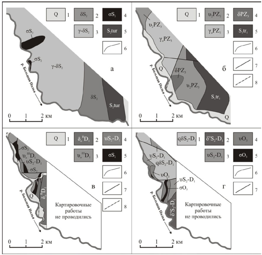 Рисунок 2 – Изменение представлений о геологическом строении площади (при написании индексов сохранен авторский вариант) а – фрагмент геологической карты листа Q-41-XXXI (К. А. Львов, Н. А. Сирин, 1947 г.): 1 – четвертичные отложения; 2 – габбро, габбродиориты, габбродиабазы; 3 – инъекционный габбро-гранитный комплекс; 4 – перидотиты, пироксениты, серпентиниты; 5 – турватская свита: кремнистые сланцы, диабазы, порфириты, спилиты и их туфы; 6 – геологические границы б – фрагмент геологической карты листа Q-41-XXXI (М. П. Мезенцев, 1964 г.): 1 – четвертичные отложения; 2 – роговообманковое габбро; 3 – плагиограниты; 4 – диориты, кварцевые диориты; 5 – нижнетурватская свита (венлокский ярус): диабазы, диабазовые порфириты; 6 – геологические границы; 7 – разрывные нарушения; 8 – разрывные нарушения под четвертичными отложениями в – фрагмент геологической карты листа Q-41-121-Г (Н. И. Литовченко, 1966 г.): 1 – четвертичные отложения; 2 – диориты, кварцевые диориты; 3 – роговообманковое габбро; 4 – габбро, метагаббро; 5 – перидотиты (верлиты, лерцолиты); 6 – геологические границы; 7 – разрывные нарушения; 8 – разрывные нарушения под четвертичными отложениями г – фрагмент геологической карты листа Q-41-121-Г (Н. А. Петенин, 1994 г.): 1-3 – платиноносная ассоциация: 1 – кварцевые диориты роговообманковые; 2 – лампрофировые диориты; 3 – габбро роговообманковое, габбро инъекционное; 4-5 – офиолитовая ассоциация: 4 – габбро офитовое; 5 – серпентиниты апогарцбургитовые; 6 – геологические границы; 7 – разрывные нарушения