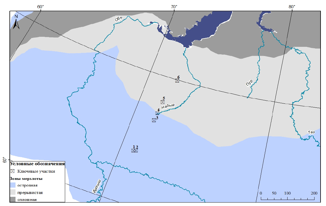 Исследования проводились с использованием метода тестовых участков. На территории исследований в пределах зон прерывистой и островной мерзлоты Западной Сибири выбраны 6 тестовых участков (ТУ), схема расположения которых приведена на рис. 1, где показано, согласно [4], расположение зон прерывистого и островного распространения мерзлоты на территории Западной Сибири.