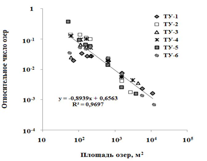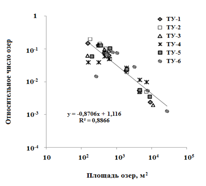 Как видно из рис. 2 и 3, несмотря на существенные различия в плотности озер и степени заозеренности территорий на разных ТУ (см. табл. 2), графики гистограмм распределений озер по их размерам на всех ТУ достаточно близки друг к другу, что свидетельствует о достаточно высокой степени близости эмпирических распределений малых термокарстовых озер на разных тестовых участках. Следовательно, можно принять, что распределение малых озер с площадями от 100 м2 до 1 га в зонах прерывистого и островного распространения мерзлоты Западной Сибири достаточно хорошо описывается степенной функцией, что подтверждает результаты исследований распределения малых озер в зоне мерзлоты Западной Сибири, полученные в [6] с использованием снимков другого космического аппарата QuickBird.