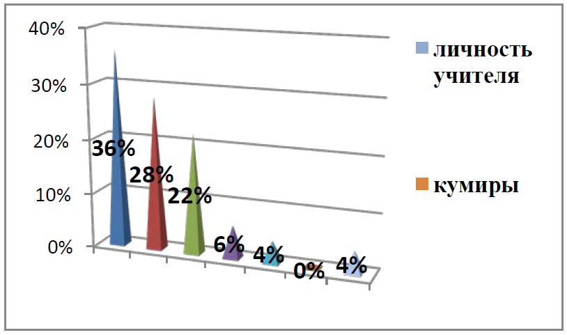 Анализ результатов опроса первокурсников с целью определения ведущих факторов, повлиявших на формирование и развитие личности студентов, на основе самооценки, показал, что ведущим фактором является пример родителей – 36 % от числа опрошенных студентов, затем самовоспитание – 28 %, вариант «пример родителей» и «самовоспитание» выбрали 22 % студентов. Такой фактор, как роль школы, учителя, выбрали – 6 % , а вариант личности учителя и общение с ним выбрали всего два человека – 4 %. Таким образом, 86 % опрошенных студентов считают, что на их формирование и развитие личности в большей степени оказали влияние два фактора – пример родителей и самовоспитание рис. 2. Действительно, в семье, прежде всего, закладываются основы социального становления человека, его духовно-нравственного развития, отношение к стране, в которой он живет, природе, родникам, которые его окружают, людям, семье, отцу, матери, духовно-нравственным ценностям, таким как добро, милосердие, честность, честь, совесть, отношение к труду, учебной деятельности и др.