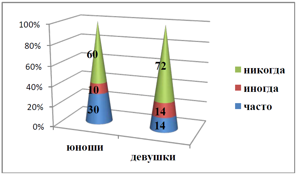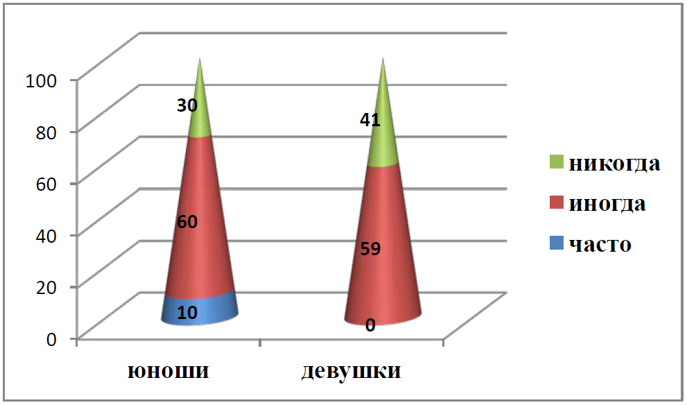 Часто принимают алкогольные напитки только 10 % опрошенных юношей, у девушек данный вариант не был выбран. Иногда принимают алкоголь 60 % юношей и 59 % опрошенных девушек, практически одинаковые показатели, значимых различий нет. Не употребляют 30 % опрошенных юношей и 41 % девушек.
