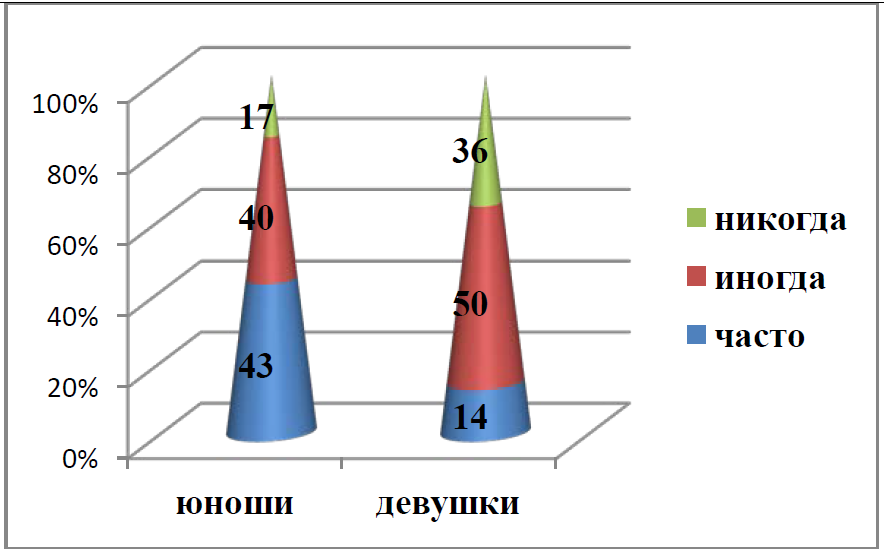 Как видно из представленной гистограммы на рис. 5, среди опрошенных юношей почти половина – 43 % часто сквернословят, 40 % иногда и лишь 17 % не сквернословят, готовы с уважением относиться к основному средству коммуникации в общении.