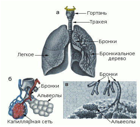 Рисунок 1 – Строение легких: а) воздухоносные пути и респираторные отделы; б) легочные альвеолы и их кровоснабжение; в) долька легкого