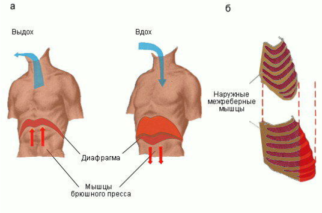 Рисунок 2 – Механизм дыхательных движений (изменение объема грудной клетки) за счет диафрагмы и мышц брюшного пресса (а)за счет сокращения наружных межреберных мышц (б)