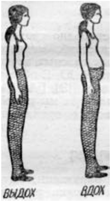 - И. П.(Исходное положение) – встать прямо, руки опущены, спина прямая, смотреть перед собой. Выдох через рот на п-фффф живот втянуть;