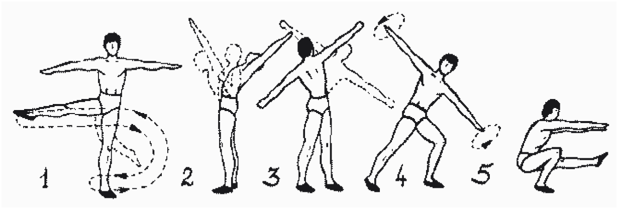 - Круговые движения туловищем. 12 «кружений» при 6 дыханиях.