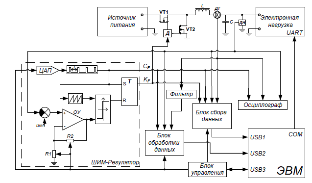 Экспериментальная установка (рисунок 1) состоит из следующих элементов: Силовая часть (Блок питания, понижающий преобразователь напряжения (ППН), нагрузка), ШИМ-регулятор, блок управления, аналоговый фильтр низких частот (ФНЧ), блок обработки данных (БОД), ЭВМ.
