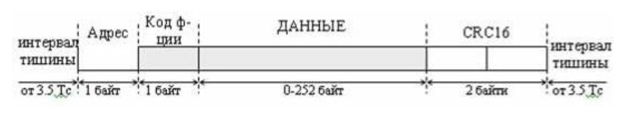Modbus – открытый коммуникационный протокол, основанный на архитектуре master-slave (главный – ведомый). Формат кадра показан на рисунке 4.
