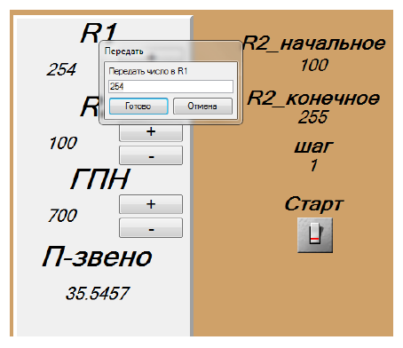 ЭВМ задает параметры регулятора, сохраняет и визуализирует данные. Для управления экспериментальной системой было разработано программное обеспечение на основе SCADA-системы TraceMode 6. Пример графического интерфейса оператора представлен на рисунке 5. Пользователь может плавно вручную изменять параметры путем нажатия на кнопки «+» и «–», или задать новое произвольное значение, нажав на само число, при этом появится новое окно «передать». При этом значения задаются в условных единицах в диапазоне [0...255], что соответствует сопротивлению 40..10000 Ом. Общая формула расчета коэффициента усиления определяется формулой: