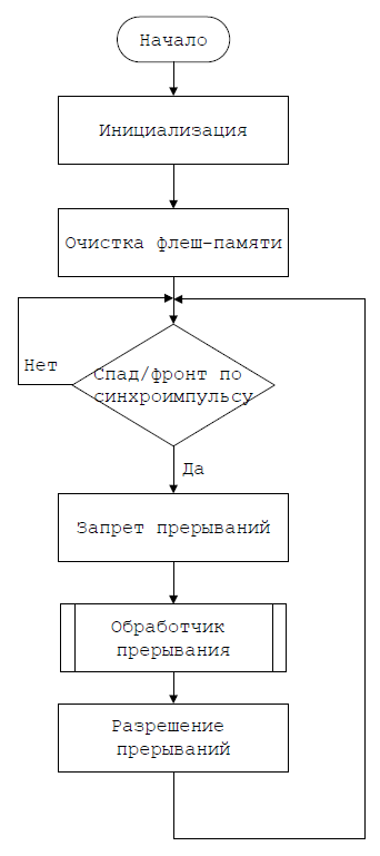 Блок обработки данных начинает свою работу с инициализации: аналогово-цифрового преобразователя (АЦП), контроллера прямого доступа к памяти (ПДП), универсального асинхронного приёмопередатчика (UART), и настройки векторов прерываний. С завершением инициализации выполняется очистка флеш-памяти и старт АЦП. После БОД переходит в режим ожидания (бесконечный цикл). После получения синхроимпульса блоком обработки данных осуществляется вызов прерывания. В обработчике прерывания сохранение и обработка данных.