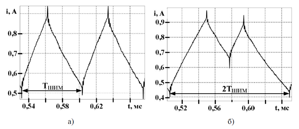 На рисунке 8а показан эксплуатационный процесс в ИСПЭ, который представляет собой устойчивый периодический процесс преобразования энергии с частотой ШИМ. В результате потери устойчивости происходит изменение частотных и пульсационных характеристик процесса преобразования энергии и возникает аномальный процесс – рисунок 8б.