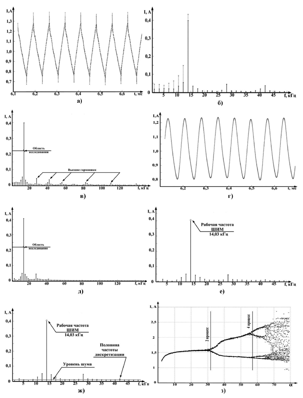 В рамках исследования динамики импульсного преобразования энергии проводится анализ частотного спектра в диапазоне (0...14 кГц), где 14 кГц – частота синхронизации ШИМ регулятора [3]. Как видно из рисунка 1в, вне области исследования (0...14 кГц) имеется значительное количество высших гармоник с амплитудами сигнала более 10 % от основной. В этой связи, согласно [4], изменение частоты дискретизации без возникновения эффекта элайзинга невозможно.